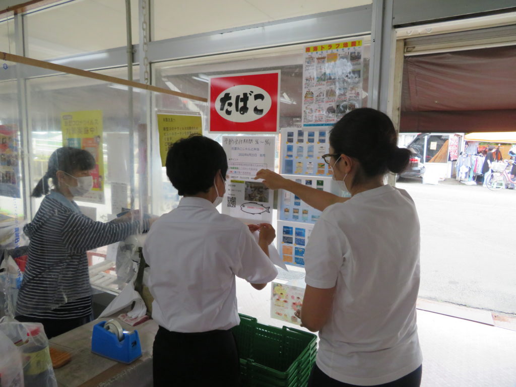 お弁当のメニューが決まれば次は広報です。どんなにいいものができても、それが多くの人に知られないと誰も買ってくれません。生徒たちはポスターを作ることを提案。他にもSNSを利用したり、田舎だからできる「町内放送」もかけてもらうよう地域自治会の役員さんにお願いしに行ったりました。今回の広報は、「買いたい」と思わせる工夫が必要です。「どういうキャッチコピーや文章なら、人が買いたいと思うのか。SNSの写真は?ハッシュタグは?」という課題を生徒たちに出し、考えてもらいました。